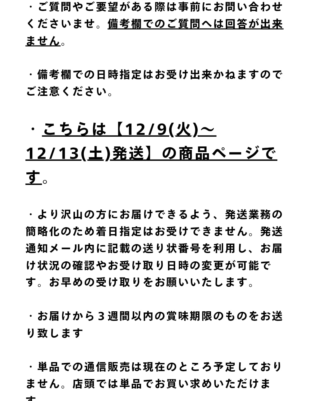よりたくさんの方にお届けできるよう、発送業務の簡略化のため着日指定はお受けできません。