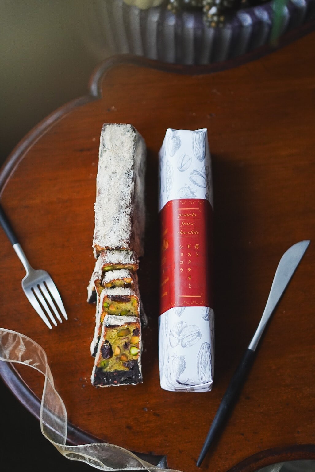 ブランデー漬け苺とピスタチオを贅沢に練り込んだ華やかな生地と、
